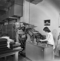 Mitarbeiterin sitzt an einem Arbeitstisch für die Diodenfertigung. Die Aufnahme wurde im Zuge der MMM (Messe der Meister von Morgen) getätigt, August 1973.